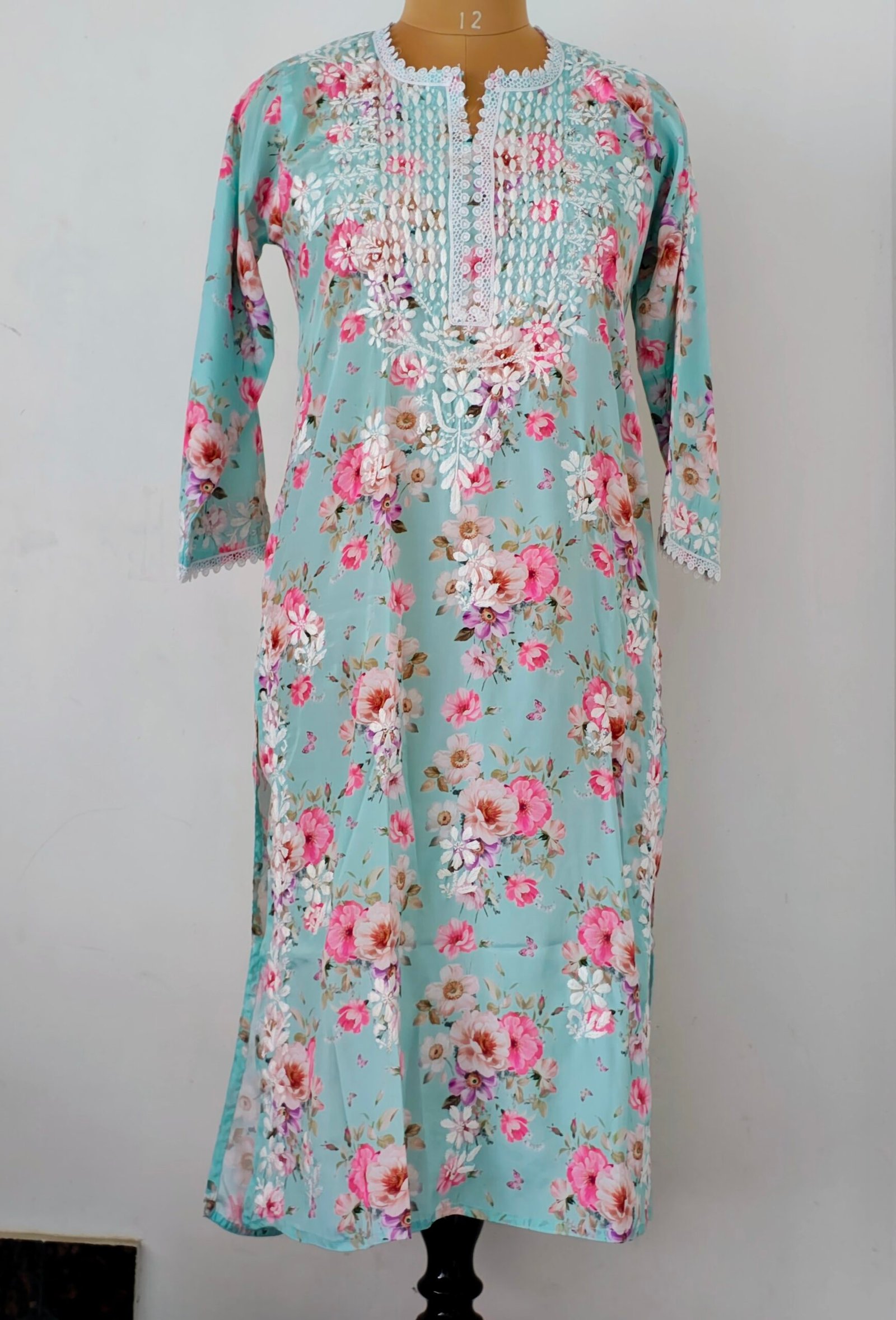 Our kurta features intricate chikankari embroidery, adding a unique charm and elegance to your wardrobe. Made from high-quality crepe fabric, it ensures a soft feel against the skin while providing breathability, ideal for both casual outings and festive gatherings.